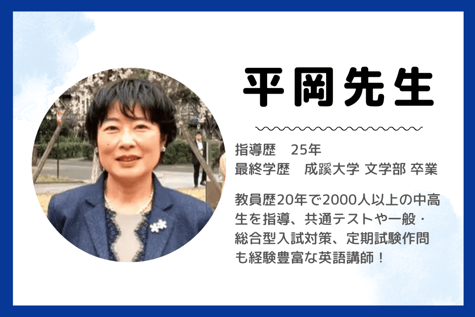 10月から家庭教師に登録した平岡です。中学・高校で約25年間、英語を教えてきました。大学附属高校での指導や担任経験を通して、さまざまな生徒と向き合ってきました。