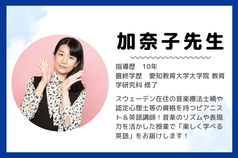 先生との出会いは一期一会。かなこ先生に会えて良かった!と思われるような先生になれるように日々心がけています。