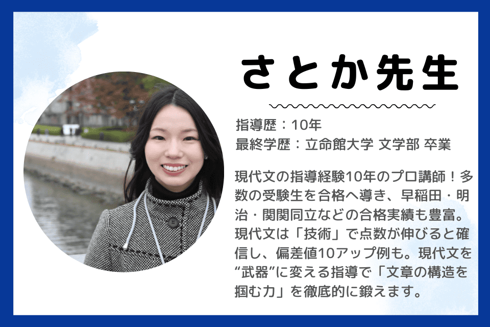 そこから勉強法を見直し、読解の考え方を徹底的に研究しました。自分の得意な科目でスランプは本当につらかったですが、この伸び悩んだ経験が「国語が苦手な生徒さんの視点」に立つ経験に繋がりました。結果的には良かったです!