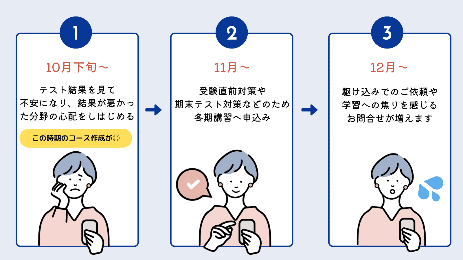 秋冬は、保護者や生徒からの問い合わせ内容が大きく変化する時期です。これまでと比べて、「焦り」や「目的意識」がより明確な問い合わせが増えます。